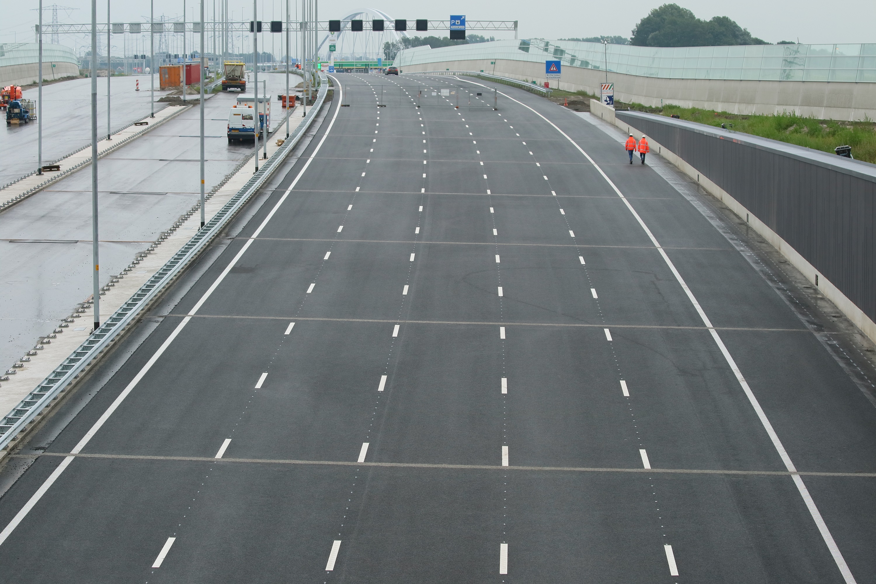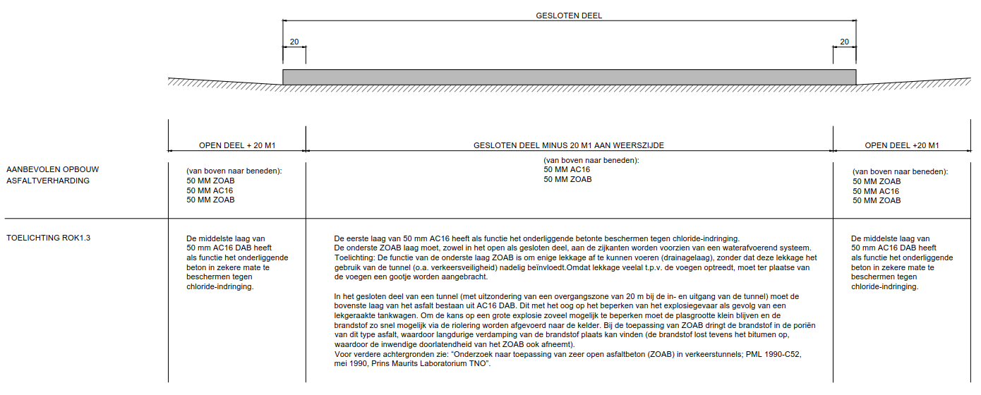De verharding in wegtunnels van rijkswegen bestaat doorgaans uit 1 principe voor de gesloten doorsnede van de tunnel, en 1 principe voor het open deel van de tunnel. In het gesloten deel van de tunnel is de verharding opgebouwd uit een open onderlaag en een dichte deklaag. De open deklaag aan de onderzijde (op het beton) dient als draineerlaag voor water dat uit de betonconstructie de tunnel binnenkomt. Zonder draineerlaag zal de verharding onder druk gezet worden, en zal het water op een ongecontroleerde wijze de weg op kunnen stromen. De draineerlaag transporteert het water naar verschillende punten in de tunnelvloer waar het water zijn weg vindt naar de riolering in de betonconstructie. Indien een voegovergang of schijnvoeg onvoldoende in staat blijkt om de bewegingen op te nemen, zal de draineerlaag toegang bieden tot de gehele rijvloer van de tunnel. Dooizouten kunnen zich hiermee onder de waterdichte laag concentreren.