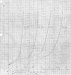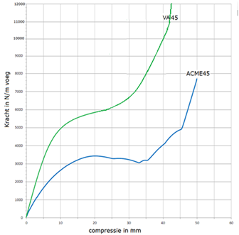 In het figuur hieronder zijn typische kracht-indrukkingsdiagram van AMCE- en VA-voegprofielen gegeven. De opspankracht bij maximale indrukking van een VA-profiel is ongeveer 6,5 à 7,0 kN/m. Bij VA-profielen loopt deze op tot 50 kN/m (!).