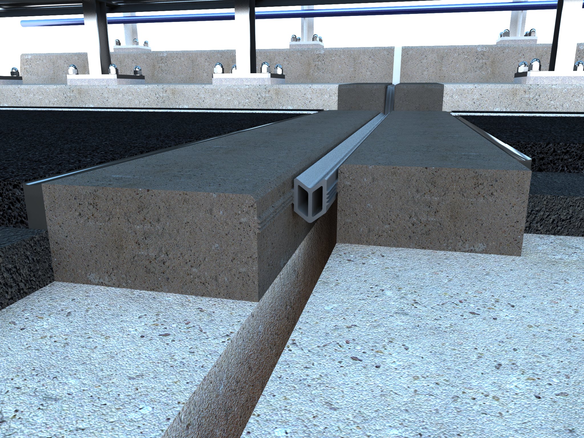 Bij dit concept ontbreken de randprofielen. Een compressie-afdichtingsrubber wordt rechtstreeks verlijmd in een sponning tussen de twee voegbalken aangebracht.