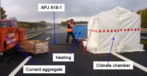 De proeftemperatuur wordt door middel van een thermokoppel gemeten op 20 mm onder het voegovergangoppervlak. Deze temperatuur kan d.m.v. toevoer van warm water of warme lucht worden gestuurd. De spoordiepte dient door middel van een Electronic Transverse Profilometer op drie plaatsen te worden gemeten: in het midden van de voegovergang en 5 cm voor en na de overgang met aangrenzende overgangsbalk/verharding. Het voordeel van deze proef is dat deze relatief snel kan worden uitgevoerd en ook in-situ ingezet kan worden, zie afbeelding 4.4.2.3b.