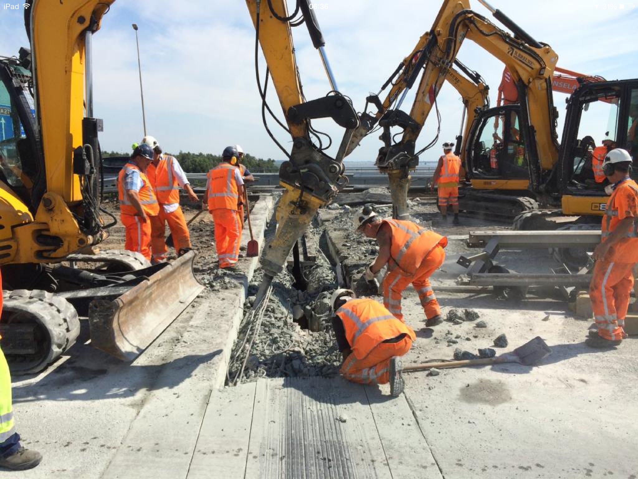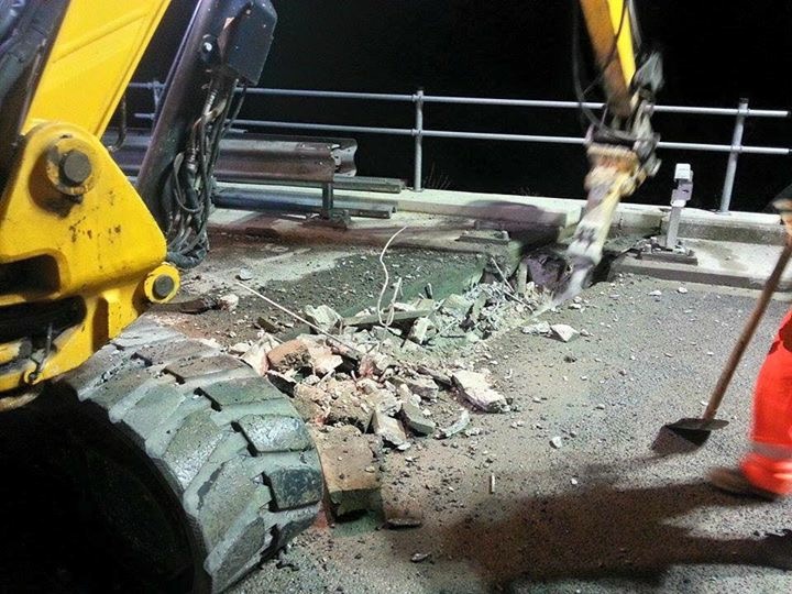 Bij het vervangen van een bestaande voegovergang wordt veelal de bestaande voegovergang verwijderd op moment dat de bestaande verharding nog aanwezig is. Het opbreken van de bestaande voegovergangen geschiedt doorgaans met een hydraulische kraan of bobcats. Veelal wordt (een deel van) de constructie vrijgemaakt door enkele zaagsneden aan te brengen met een diamantzaag, dit vereenvoudigt het uitbreken van de constructie en zorgt ervoor dat er rechte aansluiting wordt gecreëerd. Na het grove sloopwerk wordt de ondergrond beoordeeld en geverifieerd of voldoende ruimte is gecreëerd om vast te stellen dat het nieuwe product geinstallateerd kan worden.