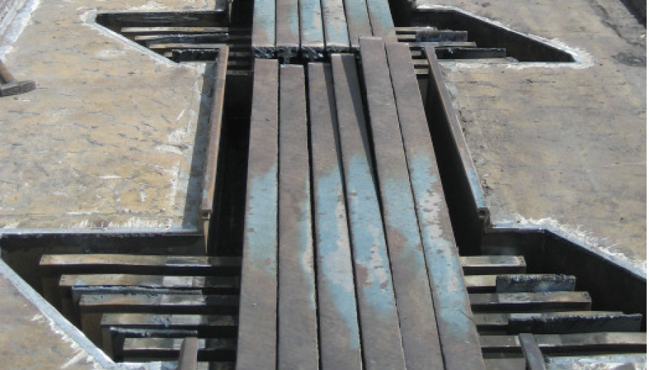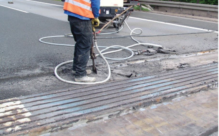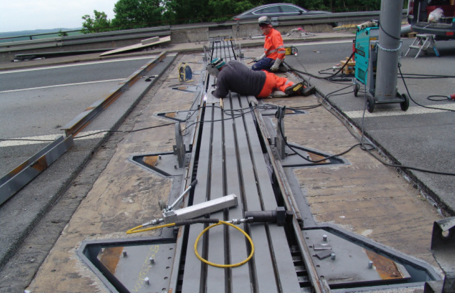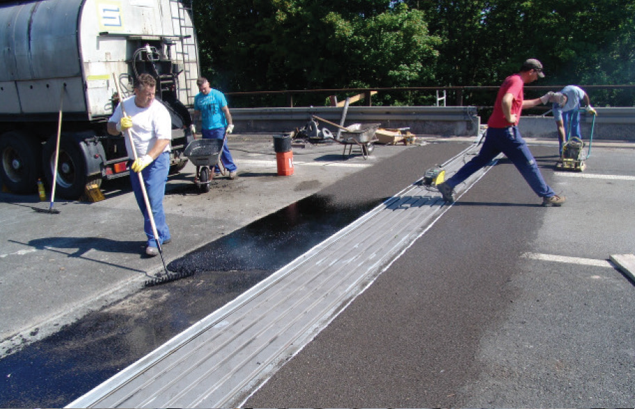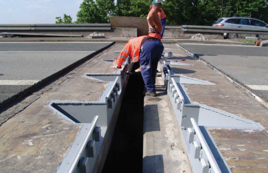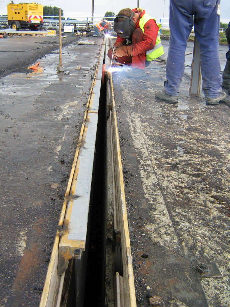 De stalen lamellenvoeg wordt met traversebalken verwijderd. Mogelijk worden de randprofielen aangepast om het inpassen van de nieuwe constructie te realiseren. Vervolgens wordt de staalconstructie in het beton gestraald en opnieuw geconserveerd. Nieuwe, brede randprofielen (met een aangelaste strip) worden in de bestaande omgeving gemonteerd. De randprofielen worden doorgaand vast gelast aan de staalconstructie. De ruimte in de aanwezige (functieloze) traversekast wordt opgevuld met een daarvoor geschikt type grout. De aansluiting of stortnaad tussen het grout en de stalen behuizing dient afgeplakt te worden alvorens het asfalt aan te brengen.