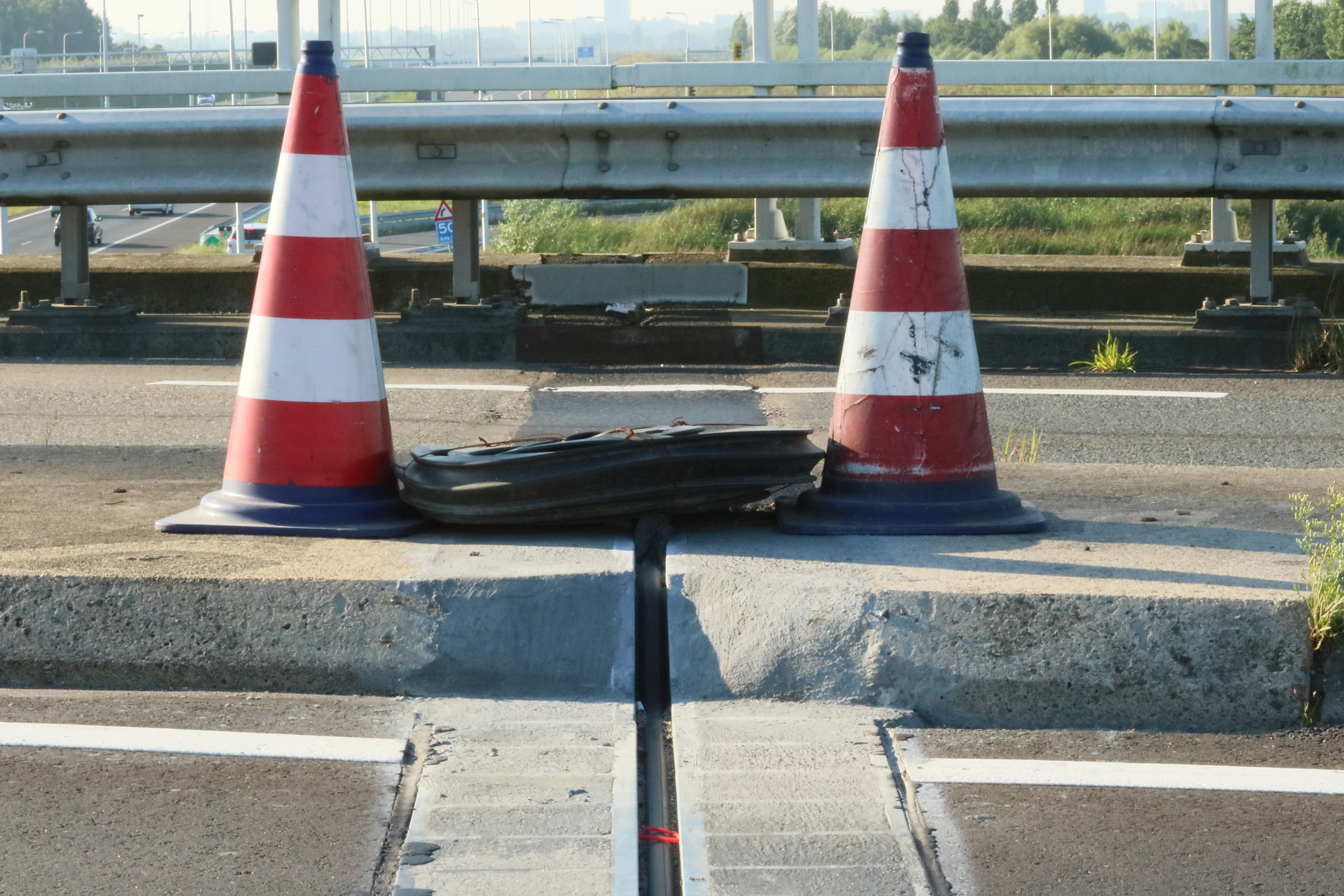 - aanbrengen aan het eind wanneer de gehele staal-beton constructie is gerealiseerd. In dit geval kan een politie-stop benodigd die het verkeer gedurende korte tijd laat stoppen zodat de afzetting kan worden omgezet. Het rubberprofiel zal in de korte stop over de 1,5 meter ‘ingelepeld’ worden zodat het resterende deel veilig kan worden aangebracht wanneer het verkeer weer mag rijden.