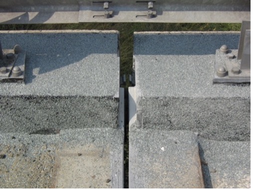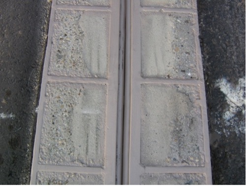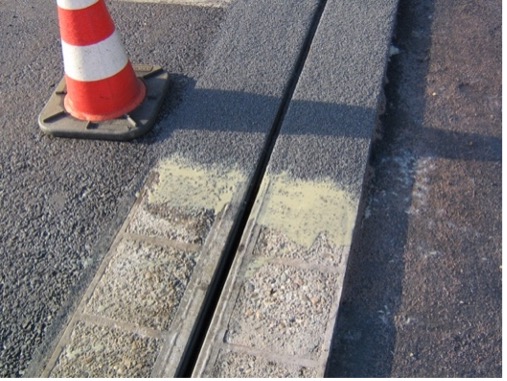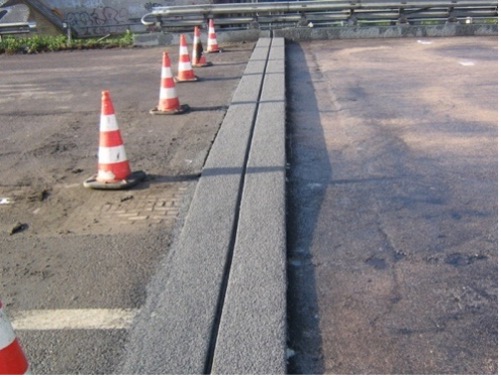 Stalen randprofielen met ingeklemde voegprofielen in onveranderde randbalken van polymeerbeton.