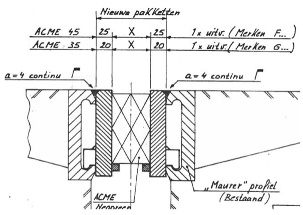 Bij behoud van de rijroosters kan het voegpakket vervangen worden. In navolgend voorbeeld is gekozen voor vervanging van het ACME-pakket door een pakket bestaande uit ondersteunde klauwprofielen van Mageba met een breedte per klauw van 25 mm. Het voegprofiel is vervangen door een vlinderprofiel.