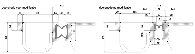Modificatie van deze voegovergangen is vaak goed mogelijk. Dit type voegovergang wordt niet meer geleverd met kokerprofiel, maar met een bandprofiel, ook wel vlinderprofiel genoemd.