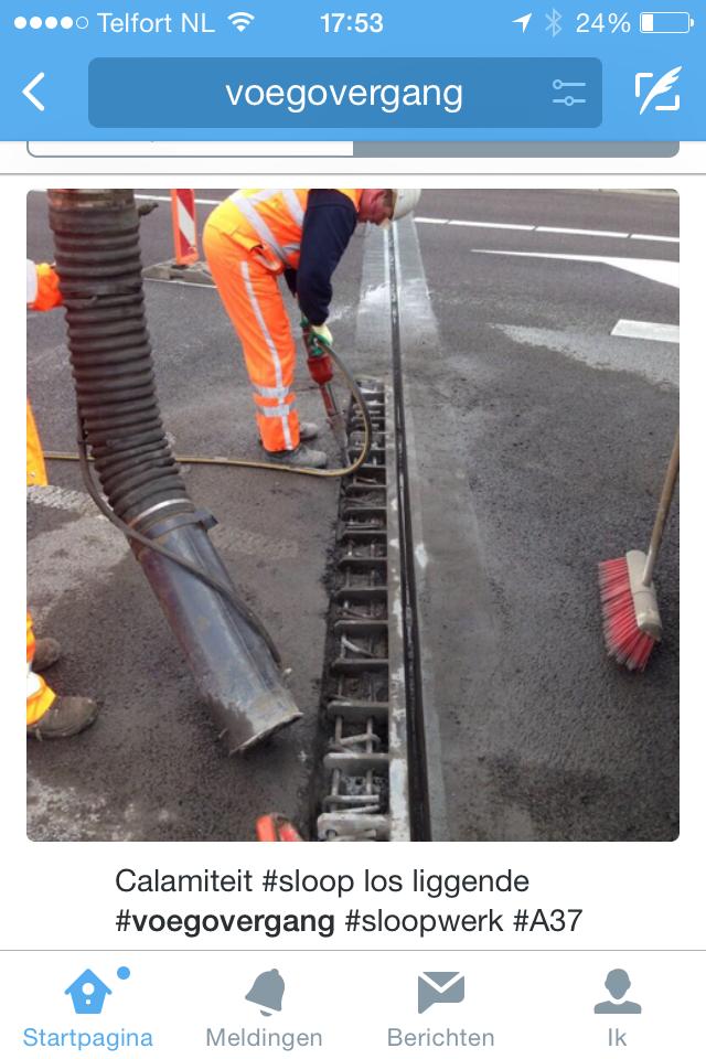 - de betreffende voegovergang valt mogelijk onder garantie van een leverancier. Raadpleeg de leverancier voor spoedherstel i.p.v. een lokale aannemer;